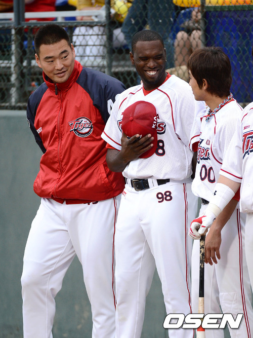 24일 오후 광주 무등야구장에서 열린 '2012 팔도 프로야구' KIA 타이거즈와 한화 이글스의 경기에 앞서 KIA 새로운 외국인 투수 헨리 소사(27)가 국민의례를 마치고 환하게 웃고 있다.
