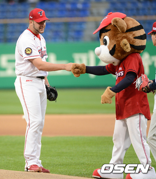 24일 오후 광주 무등야구장에서 열린 '2012 팔도 프로야구' KIA 타이거즈와 한화 이글스의 경기에 앞서 KIA 선발투수 앤서니가 KIA 마스코트 호랑이와 하이파이브를 하고 있다.