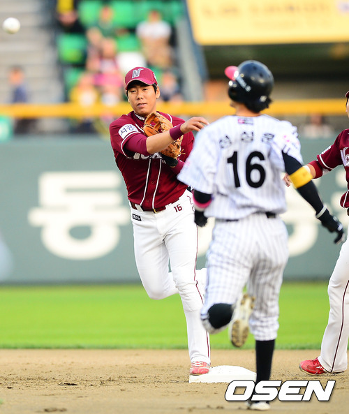 24일 오후 서울 잠실구장에서 열린 '2012 팔도 프로야구' LG 트윈스와 넥센 히어로즈와의 경기에서 1회말 무사 주자 1,3루 LG 이병규의 유격수 앞 병살타때 넥센 유격수 강정호가 2루에서 정성훈을 포스 아웃 시킨 후 1루로 송구하고 있다.