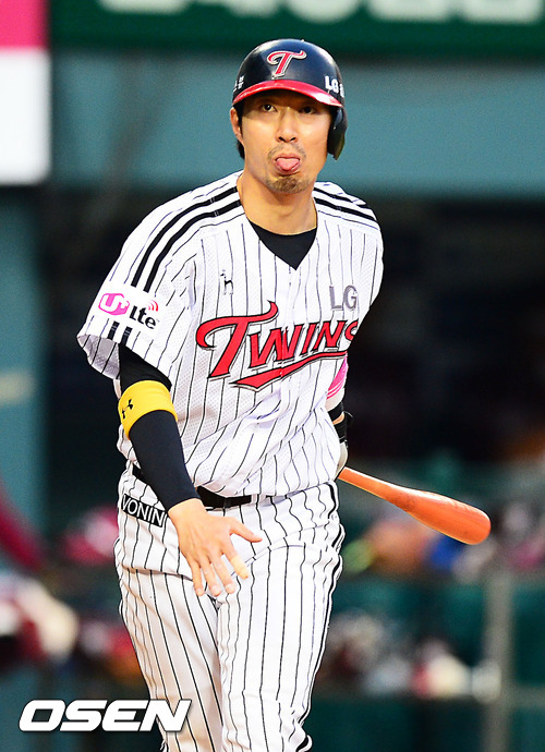 24일 오후 서울 잠실구장에서 열린 '2012 팔도 프로야구' LG 트윈스와 넥센 히어로즈와의 경기에서 2회말 2사 주자 1,2루 LG 정성훈이 타석에서 헛스윙을 한 후 혓바닥을 내밀고 있다.