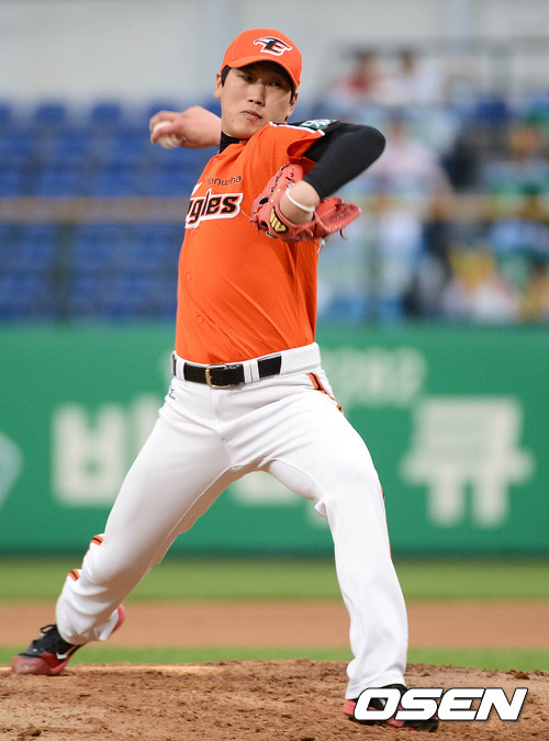 24일 오후 광주 무등야구장에서 열린 '2012 팔도 프로야구' KIA 타이거즈와 한화 이글스의 경기, 1회말 한화 선발 투수 김혁민이 힘차게 공을 던지고 있다.