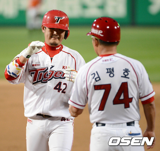 24일 오후 광주 무등야구장에서 열린 '2012 팔도 프로야구' KIA 타이거즈와 한화 이글스의 경기, 4회말 2사 3루 KIA 송산이 좌전 1타점 적시타를 치고 김평호 코치와 하이파이브를 하고 있다.