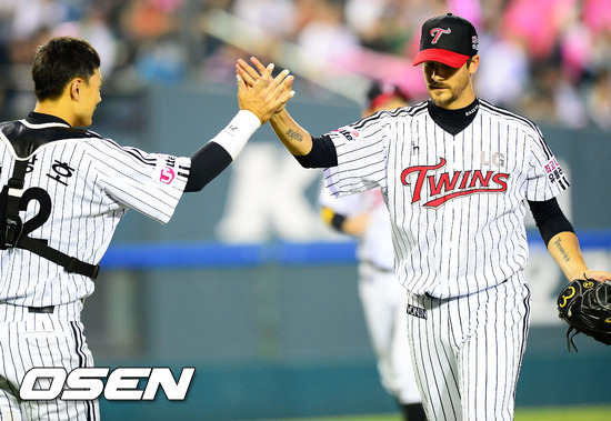 24일 오후 서울 잠실구장에서 열린 '2012 팔도 프로야구' LG 트윈스와 넥센 히어로즈와의 경기에서 4회초를 마무리한 LG 선발 주키치가 심광호 포수와 하이파이브를 하고 있다.