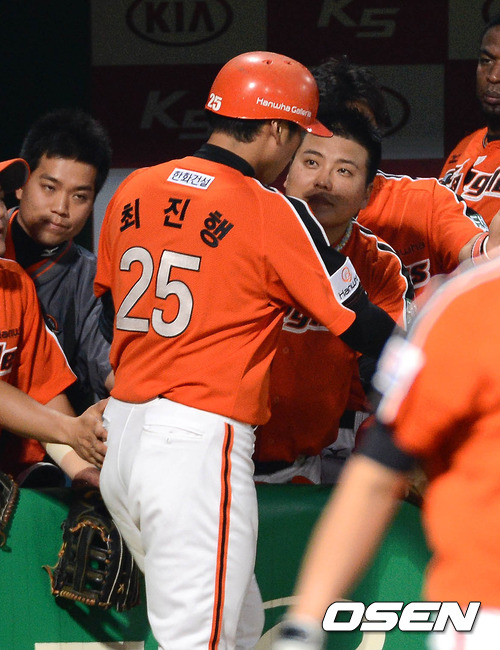24일 오후 광주 무등야구장에서 열린 '2012 팔도 프로야구' KIA 타이거즈와 한화 이글스의 경기, 5회초 무사 한화 최진행이 좌월 솔로 홈런을 날리고 더그아웃에서 김태균의 축하를 받고 있다.