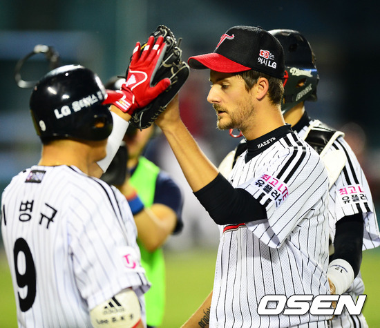 24일 오후 서울 잠실구장에서 열린 '2012 팔도 프로야구' LG 트윈스와 넥센 히어로즈와의 경기에서 5회초를 마치고 LG 선발 주키치가 덕아웃에서 이병규와 하이파이브를 하고 있다.