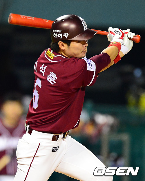 24일 오후 서울 잠실구장에서 열린 '2012 팔도 프로야구' LG 트윈스와 넥센 히어로즈와의 경기에서 6회초 1사 주자 1루 지석훈이 우중간 1타점 3루타를 날리고 있다.