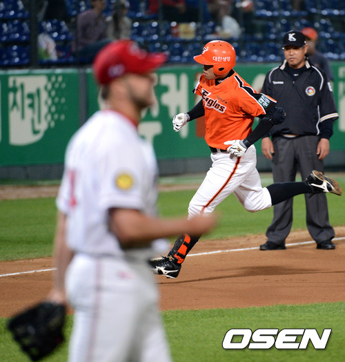 24일 오후 광주 무등야구장에서 열린 '2012 팔도 프로야구' KIA 타이거즈와 한화 이글스의 경기, 6초 2사 1루 한화 최진행이 우월 투런 홈런을 치고 그라운드를 돌고 있다.