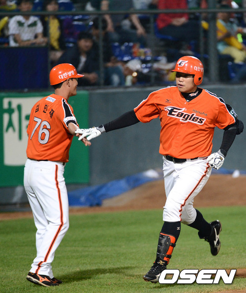 24일 오후 광주 무등야구장에서 열린 '2012 팔도 프로야구' KIA 타이거즈와 한화 이글스의 경기, 6초 2사 1루 한화 최진행이 우월 투런 홈런을 치고 김민재 코치와 하이파이브를 하고 있다.