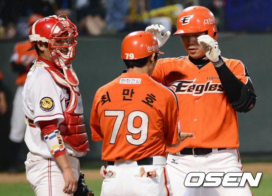 24일 오후 광주 무등야구장에서 열린 '2012 팔도 프로야구' KIA 타이거즈와 한화 이글스의 경기, 6초 2사 1루 한화 최진행이 우월 투런 홈런을 치고 최만호 코치와 하이파이브를 하고 있다.