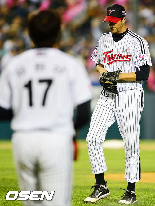 24일 오후 서울 잠실구장에서 열린 '2012 팔도 프로야구' LG 트윈스와 넥센 히어로즈와의 경기에서 7회초 무사 주자 1루 LG 선발 주키치가 마운드를 내려오고 유원상이 마운드에 오르고 있다.