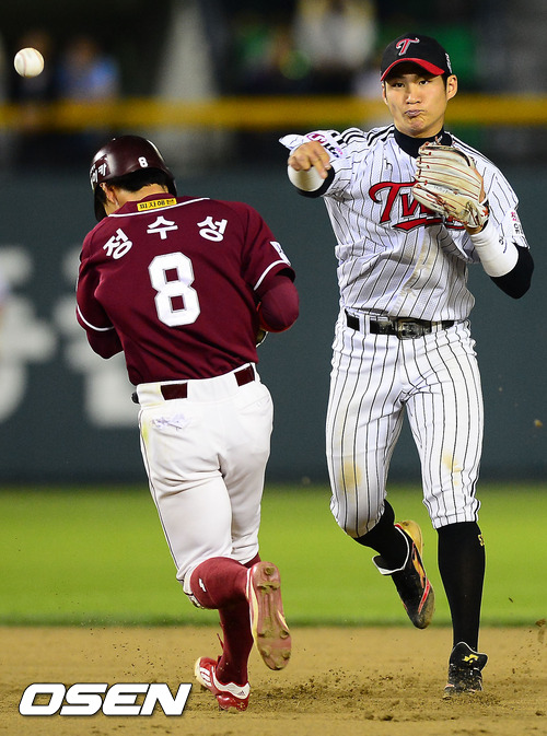 24일 오후 서울 잠실구장에서 열린 '2012 팔도 프로야구' LG 트윈스와 넥센 히어로즈와의 경기에서 7회초 1사 주자 1루 넥센 이택근의 2루수 병살타때 LG 유격수 오지환이 2루에서 정수성을 포스아웃 시킨 후 1루로 송구하고 있다.