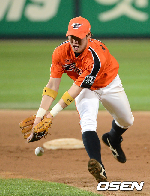 24일 오후 광주 무등야구장에서 열린 '2012 팔도 프로야구' KIA 타이거즈와 한화 이글스의 경기, 7회말 2사 한화 하주석이 KIA 최희섭의 타구를 놓치고 있다.