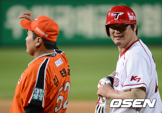 24일 오후 광주 무등야구장에서 열린 '2012 팔도 프로야구' KIA 타이거즈와 한화 이글스의 경기, 7회말 2사 KIA 최희섭이 내야안타를 치고 미소를 짓고 있다.