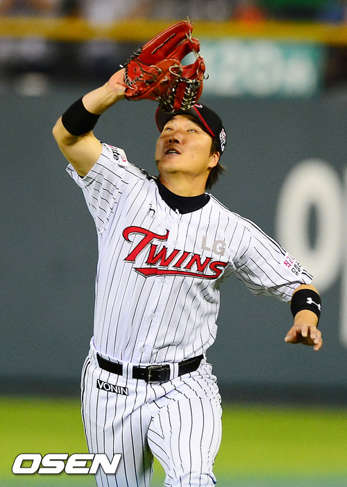24일 오후 서울 잠실구장에서 열린 '2012 팔도 프로야구' LG 트윈스와 넥센 히어로즈와의 경기에서 7회초 무사 주자 1루 넥센 김민우의 타구를 LG 우익수 이진영이 달려나오며 플라이 아웃 처리하고 있다.