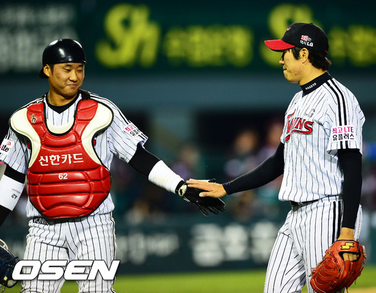 24일 오후 서울 잠실구장에서 열린 '2012 팔도 프로야구' LG 트윈스와 넥센 히어로즈와의 경기에서 8회초를 마친 LG 유원상이 김태군 포수와 하이파이브를 하고 있다.