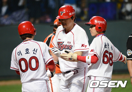 24일 오후 광주 무등야구장에서 열린 '2012 팔도 프로야구' KIA 타이거즈와 한화 이글스의 경기, 8회말 2사 1,2루 KIA 최희섭이 중월 스리런 홈런을 치고 이호신, 윤완주의 축하를 받고 있다.