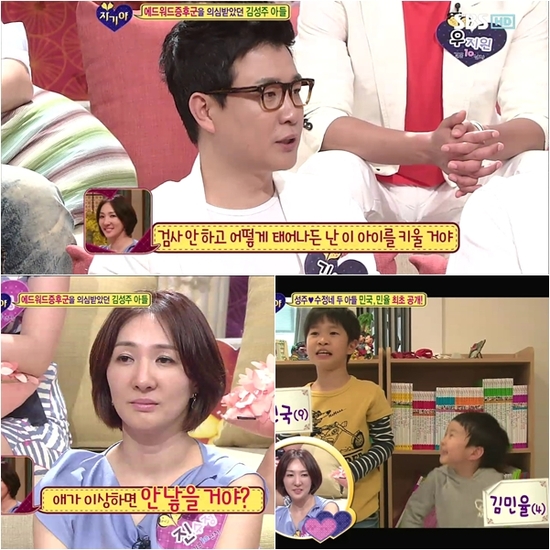 김성주는 아내 진 씨에게 양수 검사를 제안했지만 진 씨는 “에드워드 증후군이면 아기 안 낳을 것이냐”고 김성주에게 되물었다고. 김성주는 “아내가 검사 안 받고 아기가 어떻게 태어나든 키우겠다고 하는데 모성애가 대단하다는 것을 느꼈다”고 말하면서 미안한 감정을 토로했다.