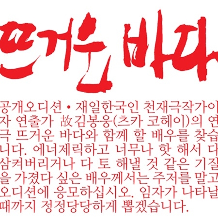 오는 8월, HanPAC 아르코예술극장 대극장에서 공연될 연극 '뜨거운 바다'의 오디션 경쟁이 치열하다.