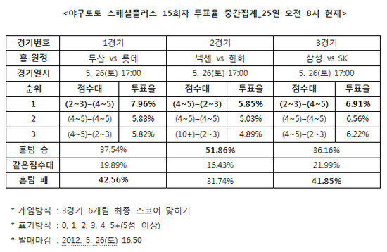 2012 프로야구 주말 3경기 대상 야구토토 스페셜플러스 15회차 투표율 중간집계