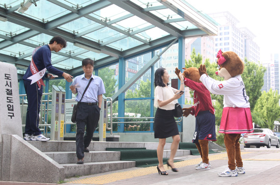 대전 시티즌의 마스코트 대전이와 사랑이 그리고 대전 프런트가 대전 주요 지하철역에 나타나 깜짝 경기홍보를 펼쳤다.