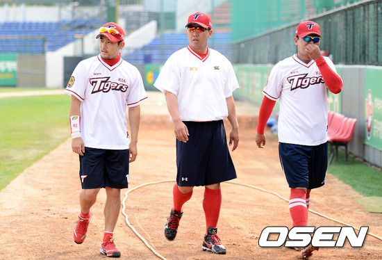 25일 오후 광주 무등야구장에서 열린 '2012 팔도 프로야구' KIA 타이거즈와 LG 트윈스의 경기에 앞서 훈련을 마친 KIA 선수들이 더그아웃으로 가고 있다.