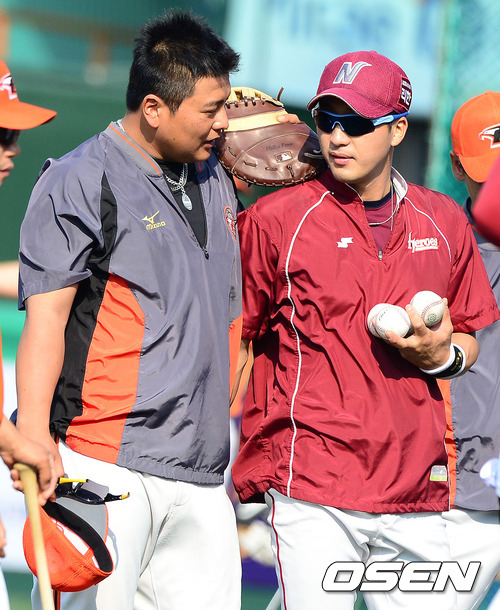 25일 오후 서울 목동구장에서 열린 '2012 팔도 프로야구' 넥센 히어로즈와 한화 이글스의 경기, 경기전 한화 김태균과 넥센 이택근이 이야기를 나누고 있다.