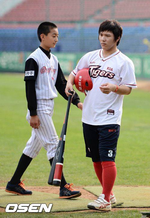 25일 오후 광주 무등야구장에서 열린 '2012 팔도 프로야구' KIA 타이거즈와 LG 트윈스의 경기에 앞서 KIA 김선빈이 훈련을 마치고 그라운드 정리를 하고 있다.