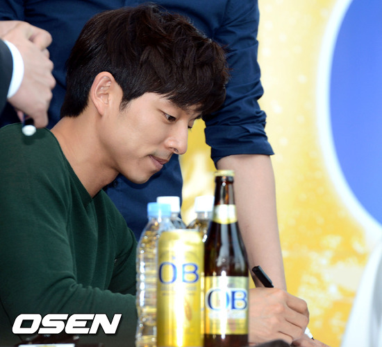 25일 오후 서울 잠실구장 중앙 매표소에서 'OB골든라거’의 광고모델이자 배우인 공유가 OB골든라거 2억병 판매 돌파를 기념해 고객 사은 팬 사인회가 열려 공유가 정성스럽게 사인을 하고 있다.