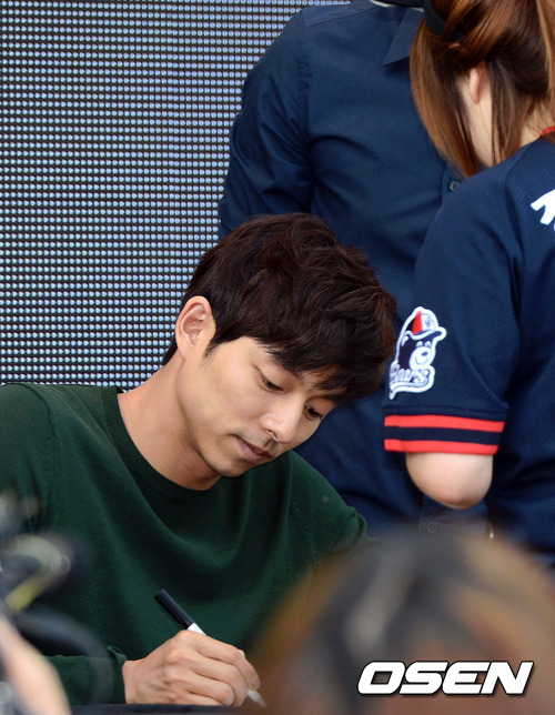 25일 오후 서울 잠실구장 중앙 매표소에서 "OB 골든라거'와 함께 하는 공유 팬 사인회'가 열려 공유가 정성스럽게 사인을 하고 있다.