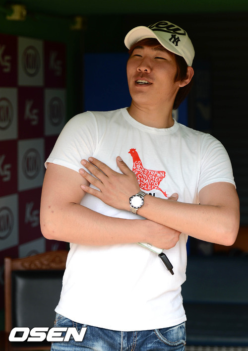 25일 오후 광주 무등야구장에서 열린 '2012 팔도 프로야구' KIA 타이거즈와 LG 트윈스의 경기에 앞서 공익요원으로 복무 중인 LG 정찬헌이 취재진과 이야기를 나누고 있다.
