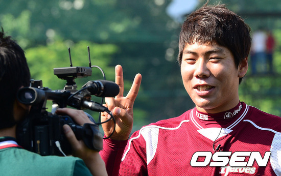 25일 오후 서울 목동구장에서 열린 '2012 팔도 프로야구' 넥센 히어로즈와 한화 이글스의 경기, 경기전 넥센 강정호가 방송 인터뷰를 하고 있다.