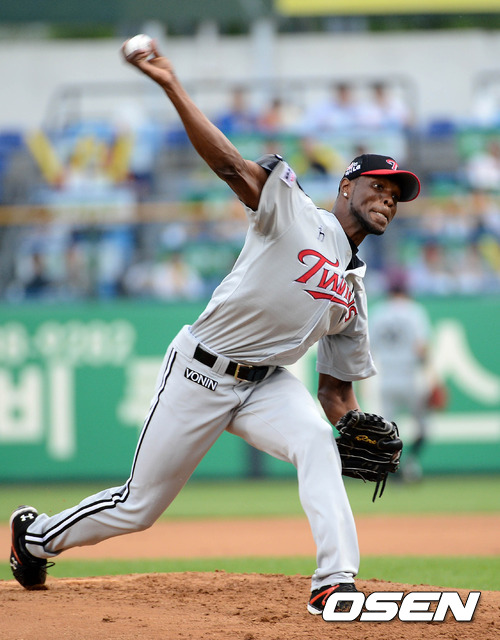 25일 오후 광주 무등야구장에서 열린 '2012 팔도 프로야구' KIA 타이거즈와 LG 트윈스의 경기, 1회말 LG 선발 투수 리즈가 힘차게 공을 던지고 있다.