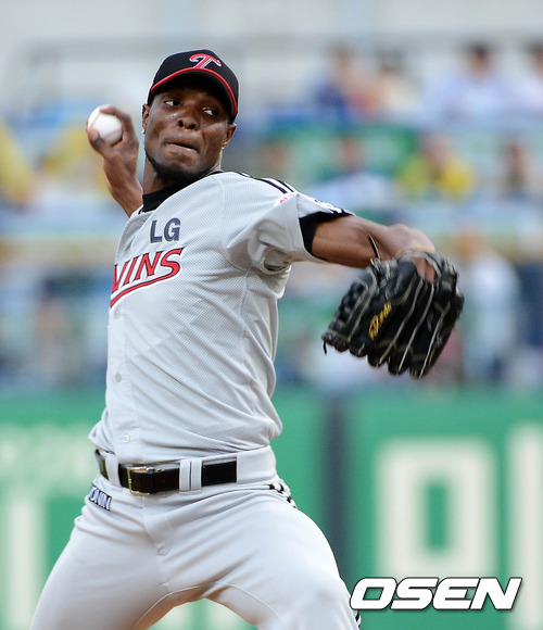 25일 오후 광주 무등야구장에서 열린 '2012 팔도 프로야구' KIA 타이거즈와 LG 트윈스의 경기, 1회말 LG 선발 투수 리즈가 힘차게 공을 던지고 있다.