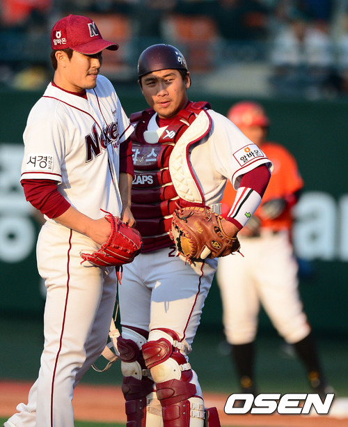 25일 오후 서울 목동구장에서 열린 '2012 팔도 프로야구' 넥센 히어로즈와 한화 이글스의 경기, 1회초 1사 만루에서 넥센 허도환이 마운드에 올라 김병현과 이야기를 나누고 있다.