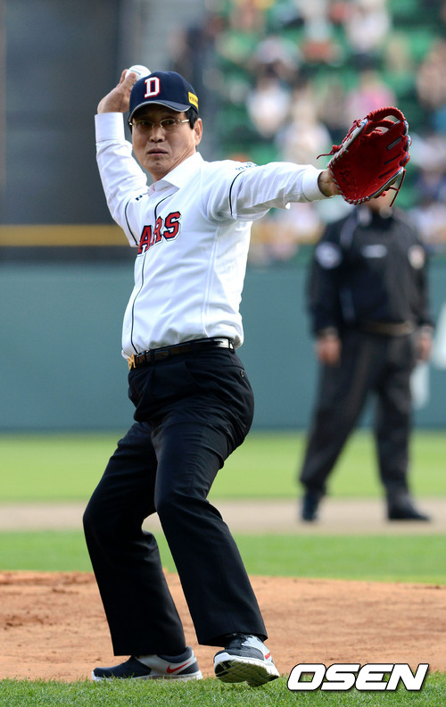 25일 오후 서울 잠실구장에서 열린 '2012 팔도 프로야구' 두산 베어스와 롯데 자이언츠의 경기 KB 국민 은행장 민병덕 행장이 시구를 하고 있다.