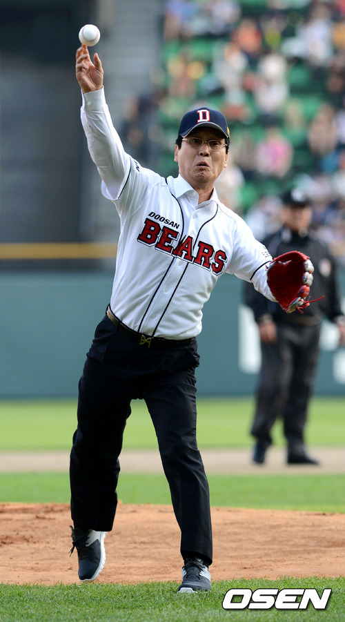25일 오후 서울 잠실구장에서 열린 '2012 팔도 프로야구' 두산 베어스와 롯데 자이언츠의 경기 KB 국민 은행장 민병덕 행장이 시구를 하고 있다.