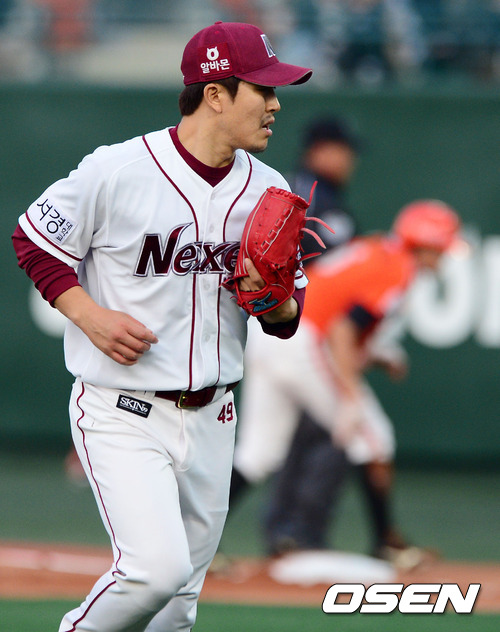 25일 오후 서울 목동구장에서 열린 '2012 팔도 프로야구' 넥센 히어로즈와 한화 이글스의 경기, 2회초 2사 1루에서 넥센 김병현이 1루주자 한화 오선진을 견제로 잡아내고 있다.