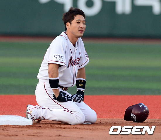 25일 오후 서울 목동구장에서 열린 '2012 팔도 프로야구' 넥센 히어로즈와 한화 이글스의 경기, 1회말 2사 1루에서 넥센 이택근이 2루 도루에 실패하며 아쉬워하고 있다.