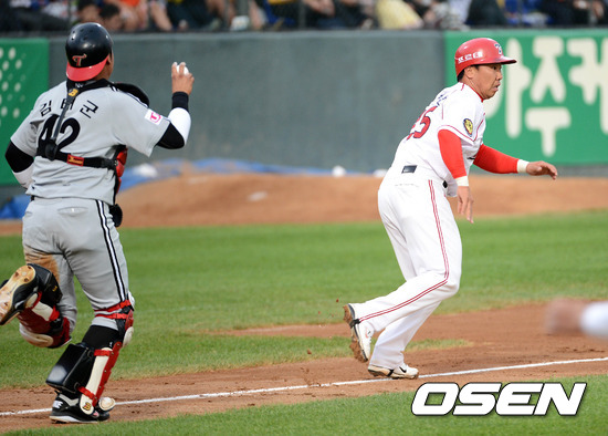 25일 오후 광주 무등야구장에서 열린 '2012 팔도 프로야구' KIA 타이거즈와 LG 트윈스의 경기, 2회말 1사 1,3루 KIA 나지완의 내야 안타때 런다운에 걸린 3루주자 이범호가 급히 귀루하고 있다.