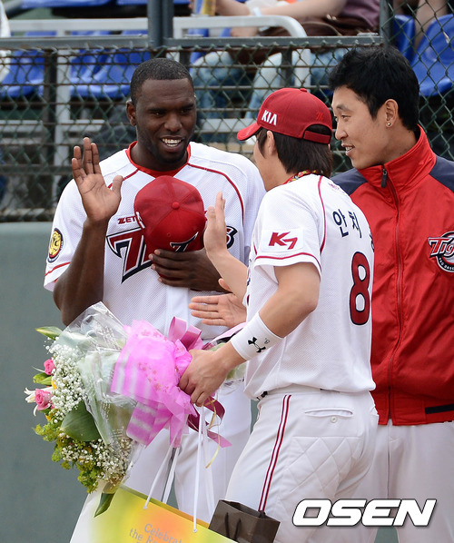 25일 오후 광주 무등야구장에서 열린 '2012 팔도 프로야구' KIA 타이거즈와 LG 트윈스의 경기에 앞서 KIA 소사가 최우수 선수상을 받은 안치홍을 축하하고 있다.