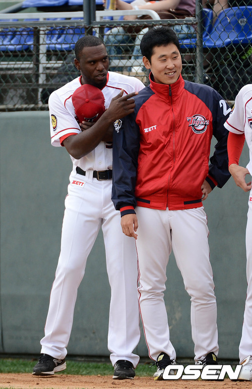 25일 오후 광주 무등야구장에서 열린 '2012 팔도 프로야구' KIA 타이거즈와 LG 트윈스의 경기에 앞서 KIA 소사가 윤석민과 장난을 치고 있다.