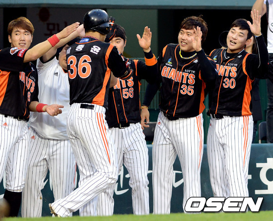 25일 오후 서울 잠실구장에서 열린 '2012 팔도 프로야구' 두산 베어스와 롯데 자이언츠의 경기 4회초 1사 1루 롯데 박종윤이 투런 홈런을 치고 덕아웃에서 선수들과 기뻐하고 있다.