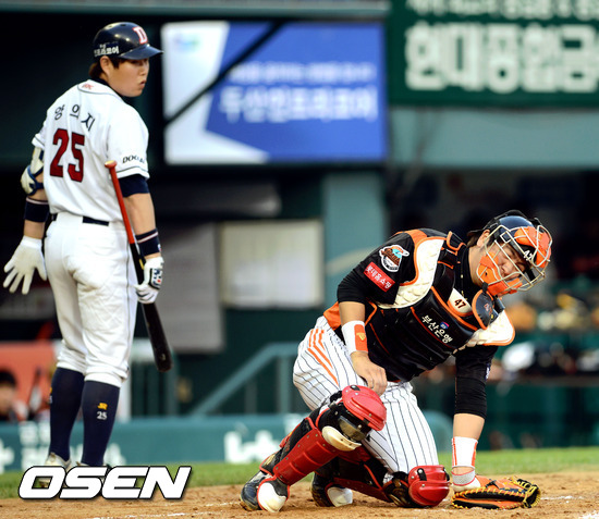 25일 오후 서울 잠실구장에서 열린 '2012 팔도 프로야구' 두산 베어스와 롯데 자이언츠의 경기 3회말 무사 1루 롯데 강민호가 두산 양의지가 타격한 파울볼에 맞아 고통스러워 하고 있다.