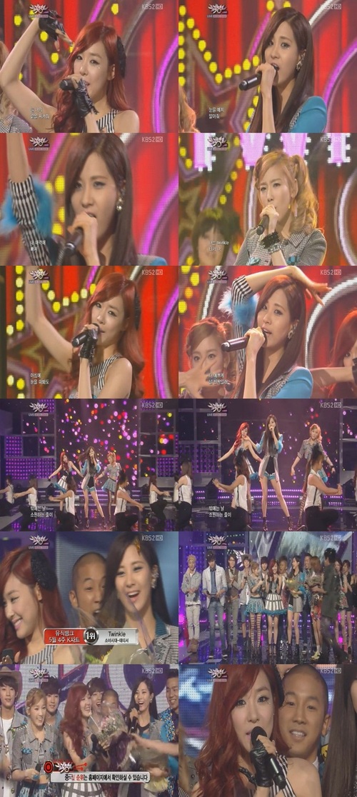 소녀시대-태티서는 25일 오후에 방송된 ‘뮤직뱅크’에 출연해 곡 ‘트윙클(Twinkle)’로 이날 함께 1위 후보에 오른 아이유를 제치고 1위 트로피를 거머쥐었다.