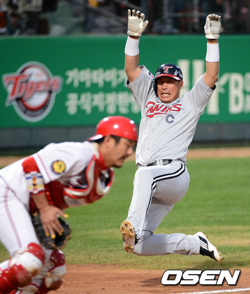 25일 오후 광주 무등야구장에서 열린 '2012 팔도 프로야구' KIA 타이거즈와 LG 트윈스의 경기, 4회초 2사 2루 LG 김태군의 우전 안타때 2루루자 이병규가 3루를 지나 홈으로 쇄도해 득점에 성공하고 있다.