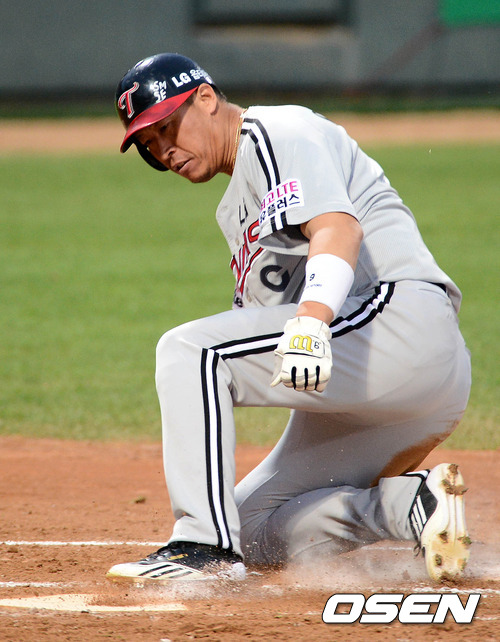 25일 오후 광주 무등야구장에서 열린 '2012 팔도 프로야구' KIA 타이거즈와 LG 트윈스의 경기, 4회초 2사 2루 LG 김태군의 우전 안타때 2루루자 이병규가 3루를 지나 홈으로 쇄도해 세이프되고 있다.