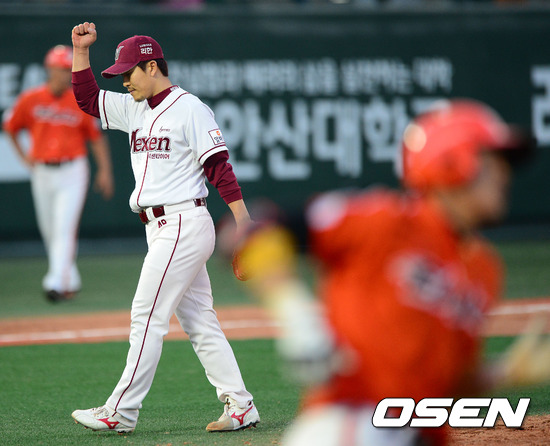25일 오후 서울 목동구장에서 열린 '2012 팔도 프로야구' 넥센 히어로즈와 한화 이글스의 경기, 4회초 2사 3루에서 넥센 김병현이 한화 하주석을 우익수 플라이로 처리하고 주먹을 불끈쥐고 있다.