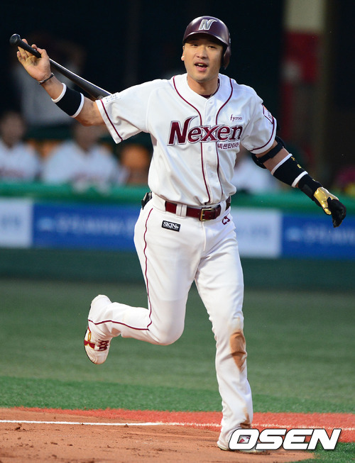 25일 오후 서울 목동구장에서 열린 '2012 팔도 프로야구' 넥센 히어로즈와 한화 이글스의 경기, 4회말 1사에서 넥센 이택근이 삼진을 당하고 아쉬워하고 있다.