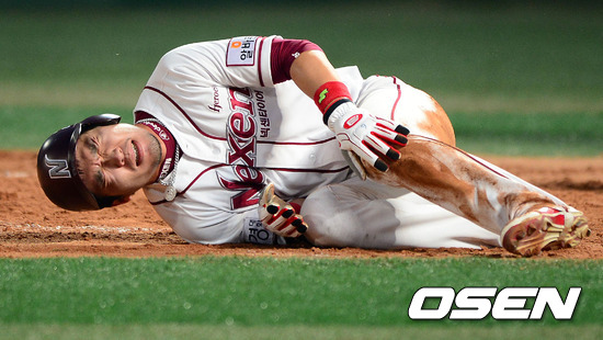 25일 오후 서울 목동구장에서 열린 '2012 팔도 프로야구' 넥센 히어로즈와 한화 이글스의 경기, 5회말 1사 3루에서 넥센 서건창의 스퀴즈번트에 지석훈이 한화 정범모에 태그아웃당하며 무릎을 부딪히고 괴로워하고 있다.