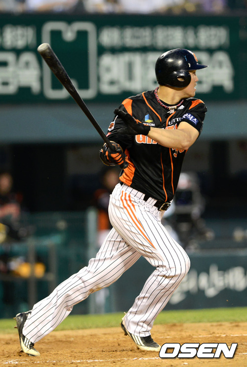 25일 오후 서울 잠실구장에서 열린 '2012 팔도 프로야구' 두산 베어스와 롯데 자이언츠의 경기 5회초 2사 1,2루 롯데 박종윤이 2타점 적시타를 치고 있다.